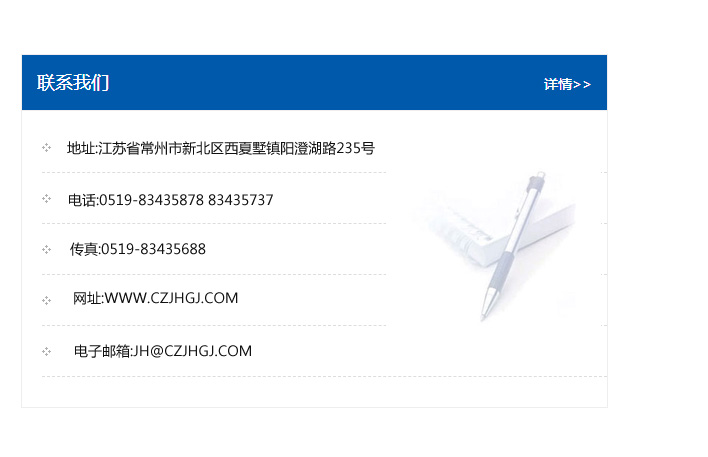 地址:常州市新北區(qū)友邦商務(wù)大廈1幢16、17層  電話:0519-85101652  傳真:0519-85112595  郵編:213022  網(wǎng)址:www_cz-jiayue_cn.stscts.com  郵箱:xiajifengaa@163.com